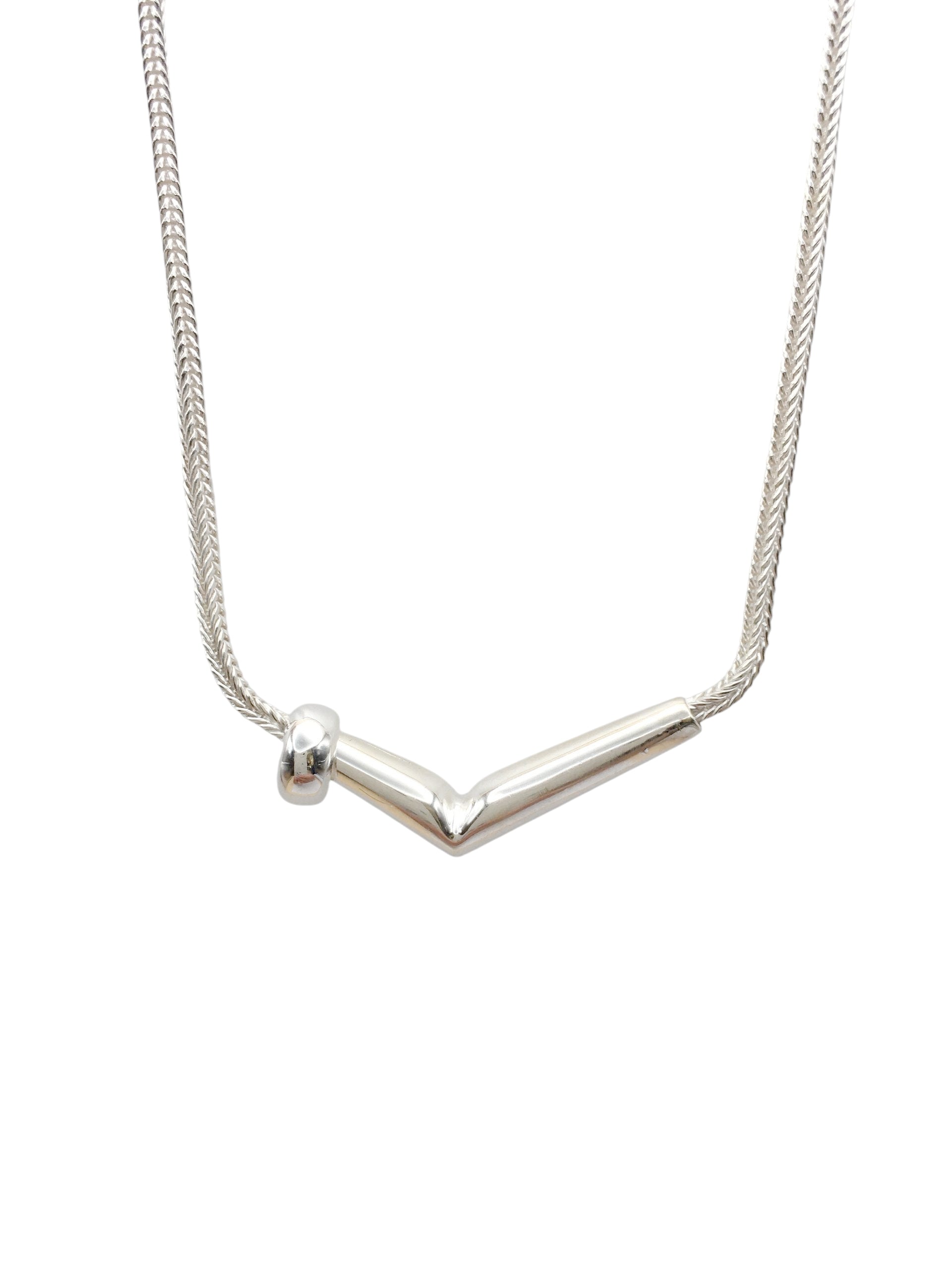 Make a bold statement with this Sterling Silver V-shaped pendant necklace, designed with a distinctive O ring detail on the side. Its sharp, edgy shape catches the eye, creating a striking look that sets you apart. Crafted from high-quality sterling silver, it offers both durability and a sleek shine, perfect for those who dare to express their unique style.